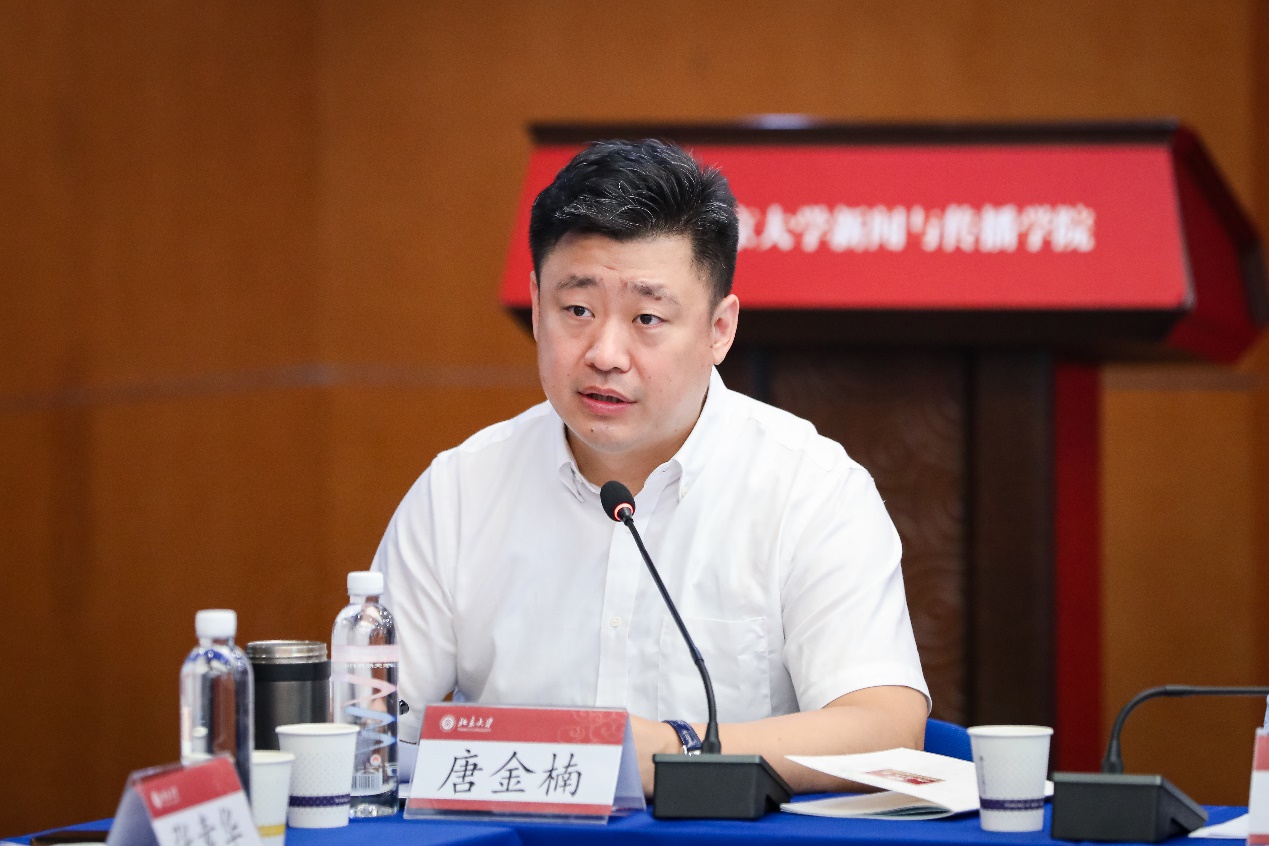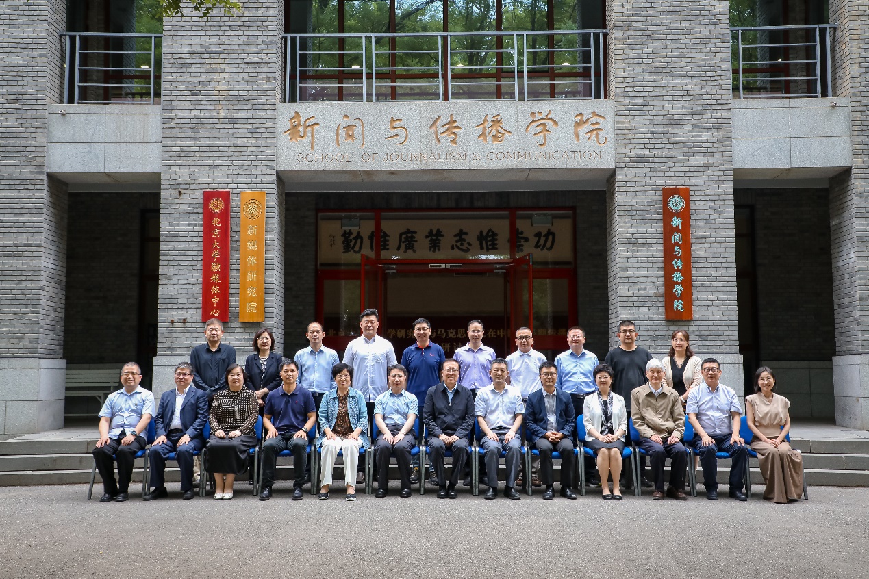 中宣部《党建》杂志社总编室主任刘文韬,北京大学校史馆馆长、档案馆馆长余浚,北京大学主题教育第四指导组组长陈向群,北京大学出版社社长马建钧,北京大学中文系教授杨铸,北京大学融媒体中心副主任汤继强,以及新闻与传播学院党政班子成员和师生代表参加会议。