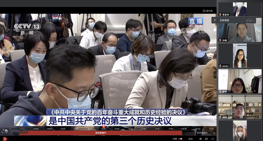 2021年11月12日,新闻与传播学院各学生党支部、团支部、团学研组织通过线上线下相结合的方式,学习《中国共产党第十九届中央委员会第六次全体会议公报》,观看新闻发布会。学习结束后,学院党委副书记卢亮、团委书记王祯、团委副书记张冉玥与部分学生骨干以线上方式展开讨论,进一步学习领会十九届六中全会精神。