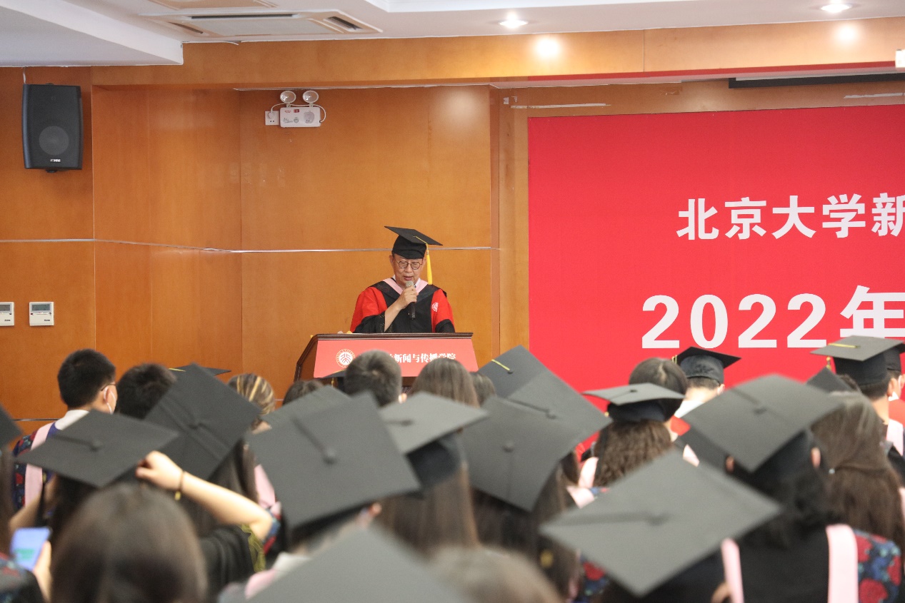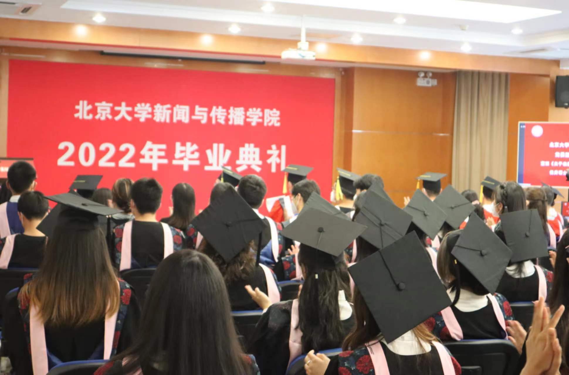 6月18日下午,北京大学新闻与传播学院2022年毕业典礼在蒙民伟楼报告厅举行。本次活动采取线上线下相结合的方式,广大师生及学生家长相聚云端,共同庆祝新传毕业生们圆满完成学业。新闻与传播学院院长陈刚,党委书记唐金楠,党委副书记卢亮,副院长陈开和、王维佳,学院学位委员会主席陆绍阳,程曼丽、吴靖、胡泳、师曾志、许静、何姝、祝帅、张慧瑜、王祯、张冉玥等老师及部分2022届毕业生线下参加典礼,严富昌、王异虹、高忠欣、刘杨、曾育平等老师和部分毕业生、家长在线上参会。