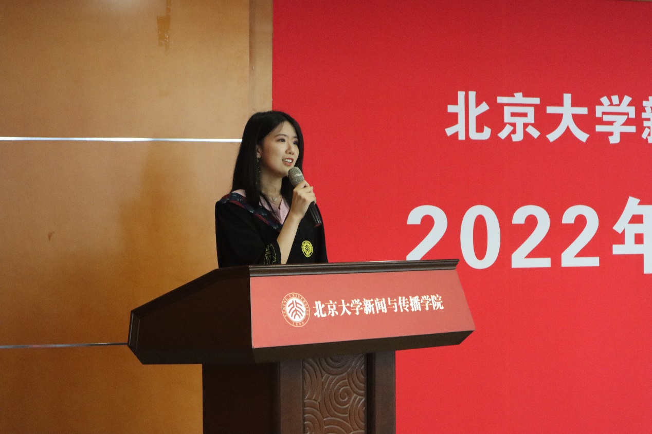 2018级本科生郭雯雯代表本科毕业生发言。她从六年前的北大梦讲起,回忆了与北大新传相遇相识相知的点滴,多元包容的培养环境给她探索和试错的勇气,不断突破的“第一次”成为挑战自我的青春脚注,扎实奋斗的汗水见证青涩到成熟的成长蜕变。在挖掘个人价值的新传四年,她也收获了值得一生感谢的良师挚友。