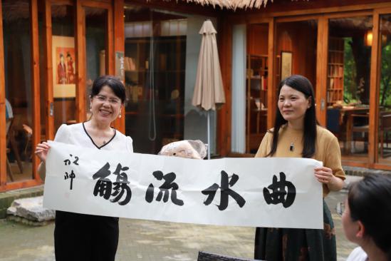 在曹雪芹纪念馆旁边的凹晶馆茶馆,北京曹雪芹基金会秘书长位灵芝女士热情接待了大家,为老师们准备了带有红楼特色的老君眉和体己茶、红楼点心和黄叶村水拔西瓜,以及红楼香扇等文创礼品,工会也向他们赠送了祝帅老师的书法作品。学院党委书记唐金楠老师则介绍了北大曹雪芹美学艺术研究中心与他们的合作成果,使老师们对当代红楼文化的“创造性转化、创新性发展”有了更深的理解。