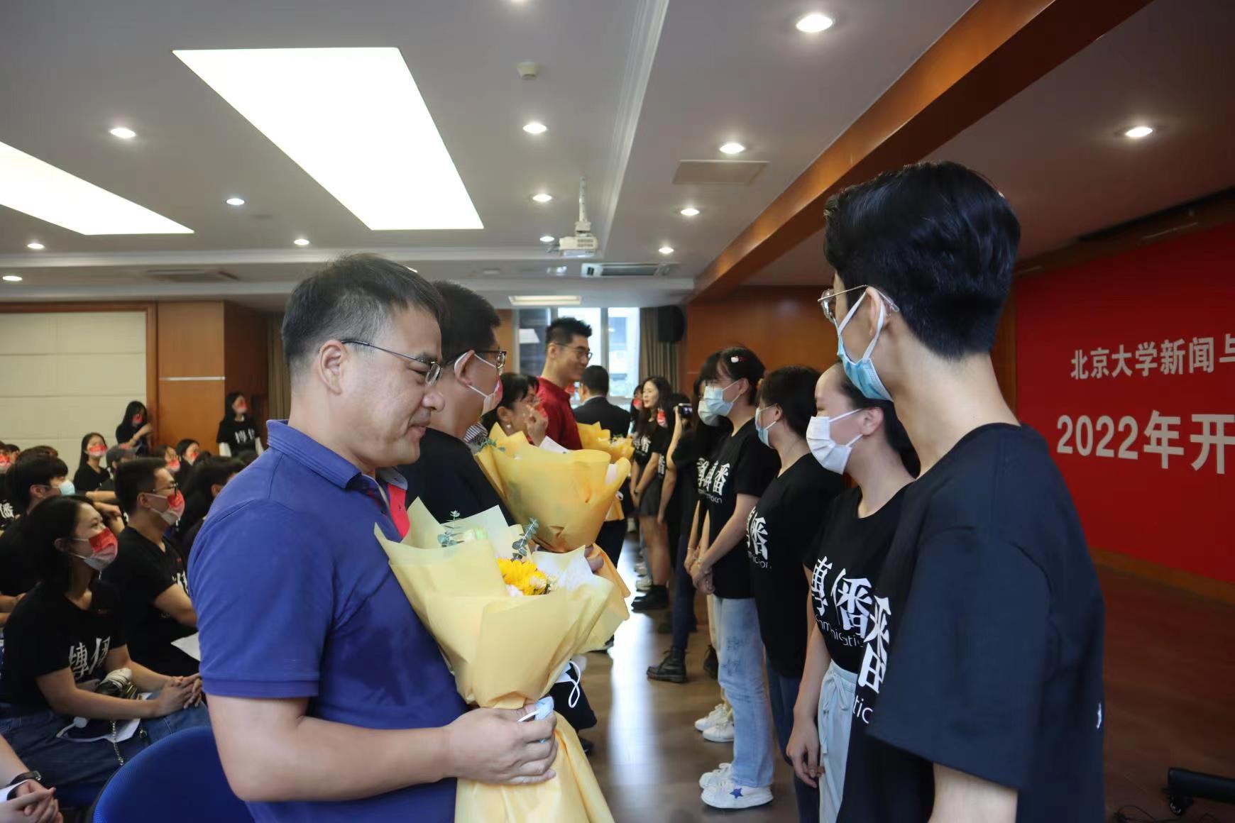 典礼伊始,大屏幕上播放了新闻与传播学院成立二十周年纪念短片,这部短片记录着北京大学新闻与传播学院的发展历程,展示出学院多年来取得的各项成就。随后大屏幕播放了2022级新传人入学报到后的精彩活动剪影,同学们在视频中朝气蓬勃的分享初入燕园的喜悦,许下未来成长的目标。伴随着庄严的国歌,开学典礼正式开始。陈开和在对新生们的到来表示欢迎后,向新生们逐一介绍了与会教师代表,并邀请线上线下各位教师代表为新生送上开学寄语。