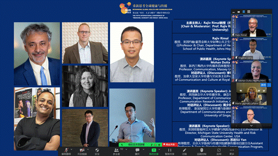 开幕式后,会议进入主旨演讲和对话环节,由美国约翰·霍普金斯大学彭博公共卫生学院健康、行为与社会学系主任Rajiv Rimal教授担任主持,新西兰梅西大学传播系首席教授及教务主任Mohan Dutta、美国康奈尔大学传播学系教授,康奈尔健康传播研究项目主任Jeff Niederdeppe,美国密歇根州立大学健康与风险沟通中心教授、主任 Maria Lapinski作为主旨演讲嘉宾,加拿大皇家大学传播与文化系主任李臻怡教授,新加坡国立大学传播与新媒体系助理教授蒋少海参与对话。
