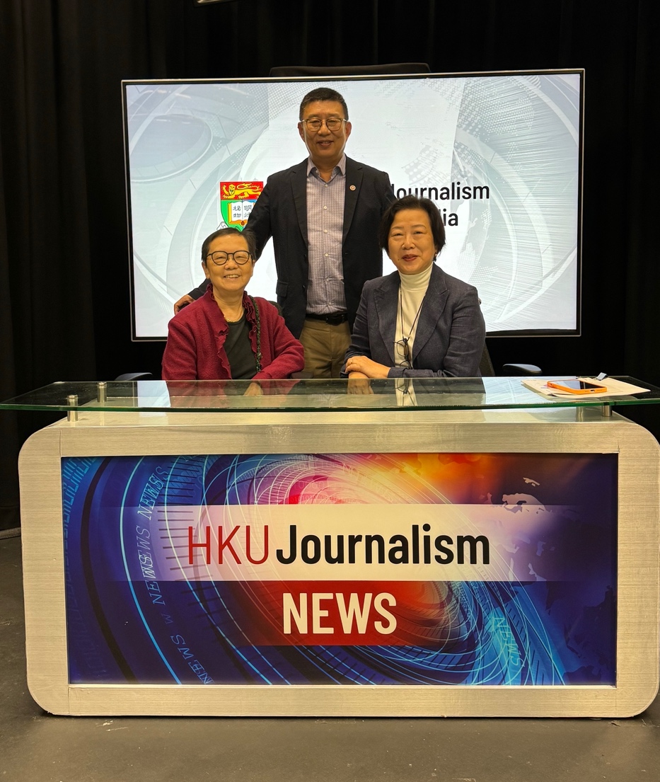 陈刚院长同新闻与传媒研究中心总监杨紫烨教授和创办人陈婉莹教授在中心演播室合影