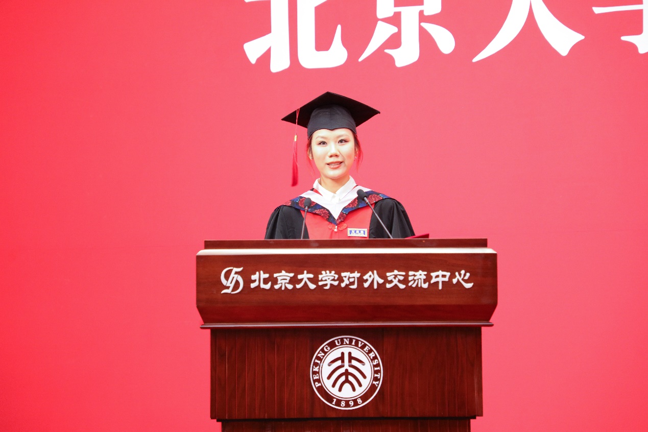硕士毕业生代表刘好以“放眼全球,扎根泥土,向光而行”为脉络,串联起首届北大国传项目学子的成长体悟。她表示,“放眼全球”的培养,赋予了超越个体、拥抱世界的格局,也让同学们更加坚定地走向国际舞台。“扎根泥土”的实践让同学们明白,真实的力量源于脚下的泥土,生动的中国故事存在于广袤的田野。展望未来,她呼吁新传人秉持“向光而行”的信念,做党的政策主张的传播者、时代风云的记录者、社会进步的推动者、公平正义的守望者,为国家发展与社会进步贡献青春力量。