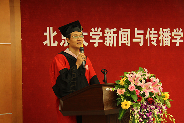 6月30日下午13:00,北京大学新闻与传播学院2014届毕业典礼在新传蒙民伟楼报告厅举行。这是在学院新大楼举办的第一个毕业典礼。新闻与传播学院院长陆绍阳教授、党委书记陈刚教授、副院长俞虹教授、吴靖教授、党委副书记王洪波以及学院的老师们出席了典礼。