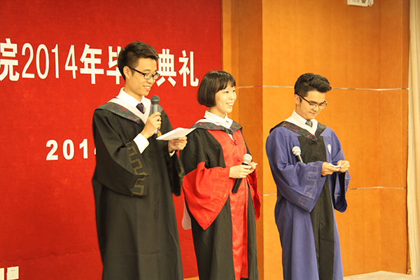 下午14:30,毕业典礼正式开始,典礼由陈刚老师主持。来自本、硕、博三个年级的毕业生代表赵恺、魏无忌、崔远航以诙谐幽默的方式介绍与会的领导和老师:“全院男神”陆绍阳院长、“北京风物大师”肖东发老师、“学术大牛”吴靖老师、总是强调“读书、英语、出国好”的王洪波老师……在此起彼伏的掌声与欢呼中,毕业生向与会老师献上鲜花,表达同学们感激与敬意。