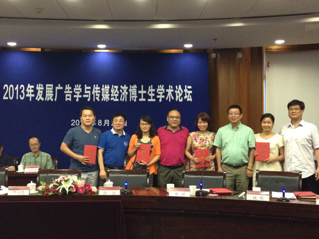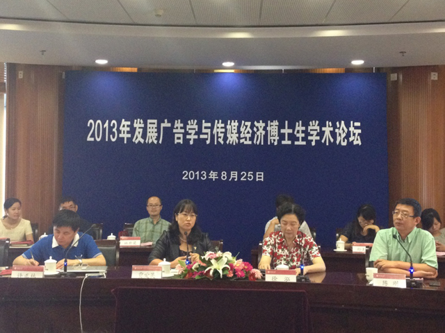 2013年8月25日,“2013年发展广告学与传媒经济博士生学术论坛”在北京大学圆满召开。本次论坛由北京大学新闻与传播学院副院长陈刚教授主持,北京大学研究生培养办公室主任贾爱英、北京大学新闻与传播学院常务副院长徐泓教授出席论坛并致辞。武汉大学姚曦教授、上海外国语大学姜智斌教授和陈正辉教授、华东师范大学杨海军教授、上海大学许正林教授、中国传媒大学张翔教授、首都经贸大学杨同庆教授、安徽大学邬盛根教授等出席论坛,并对入选论文逐一点评。
