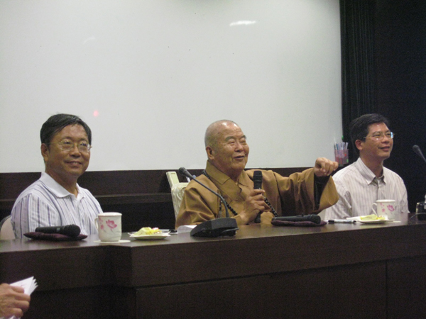 星云大师拨冗与出版学者展开讨论,从社会、文化、教育等各方面阐释心得,发人深省。大师表示,“我只想两岸和平友好”,自己真正从事和谐工作的是“和尚”——以和为尚。如同画图,颜色不一样,和谐就好看;如同歌唱,曲调不一样,和谐就好听。不一样的各司其用,和谐就好。并以“智慧创新”勉励大众,以创新的智慧,重新估定价值。星云大师与参会学者一一合影留念,并以口袋书《佛光菜根谭》与学者们结缘。