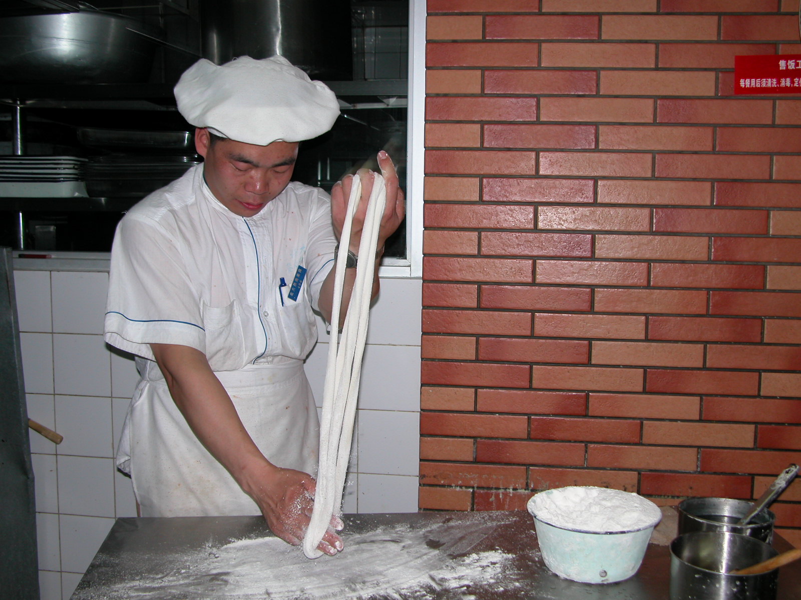 张师傅每天工作时间10个小时,没有双休日。8点上班,忙着领菜、分类、洗菜、消毒、刷菜、用机器和面、打卤、领油盐酱醋、打扫卫生。一口气就干到了中午1点钟。短暂的午觉后,下午三点半到岗上班直至晚上七点下班。在他掌勺的面食窗口,每天平均就要消耗100斤面。