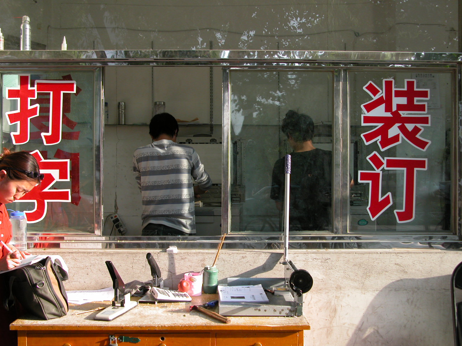 三角地。北大书屋后面有一排平房。走进其中一间,不到20平方米的屋里,靠墙摆着四台复印机、两台电脑、两台打印机和一箱箱复印纸。几个年轻人在忙碌着,有的飞快地翻书复印,有的头也不抬地敲打电脑键盘,有的在装订复印好的书页。