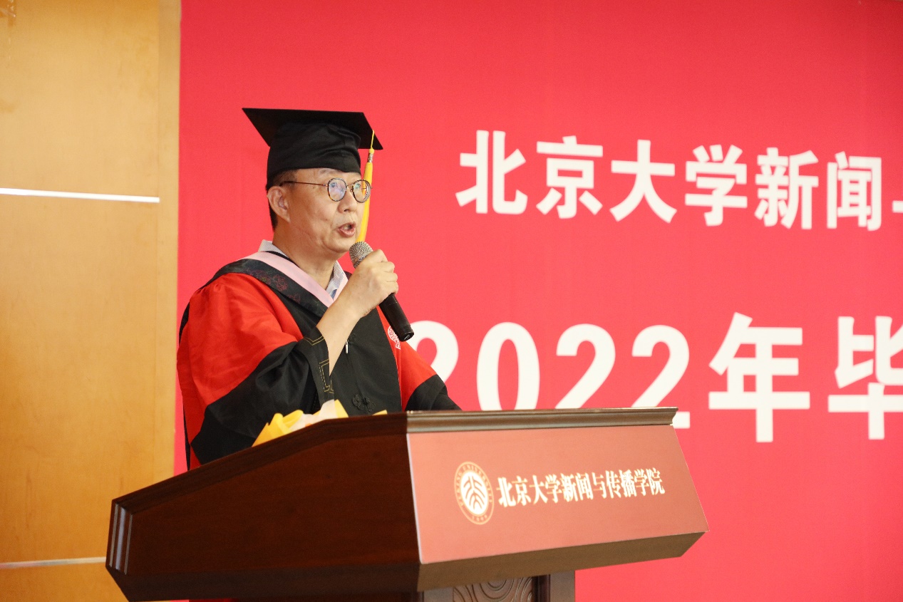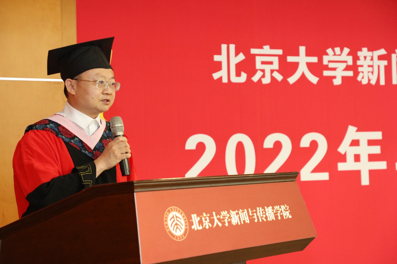陈刚首先祝贺同学们顺利毕业。他指出,在校的学习是有限的,但人生的求索是无限的,希望同学们能够树立终身学习的自觉。回顾历史,陈刚指出,变化是最大的不变,当代的新青年要有顺时而变的头脑与灵活应变的手脚,也要有放眼世界的视野与发展人类的格局,有底气更要有能力在关键时刻迎风而起、潮头挺立。国家发展呼唤青年,社会重托寄予青年。从北大新传扬帆远航的青年们,要以民族复兴为己任,把握数字化时代的传播风潮,自觉传续学院创新发展的文化脉络,发扬“铁肩担道义,妙手著文章”的新传精神,书写出不负人民与时代的青春答卷。
