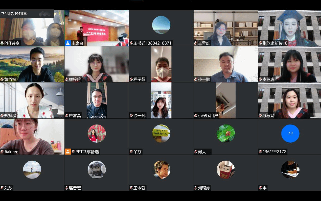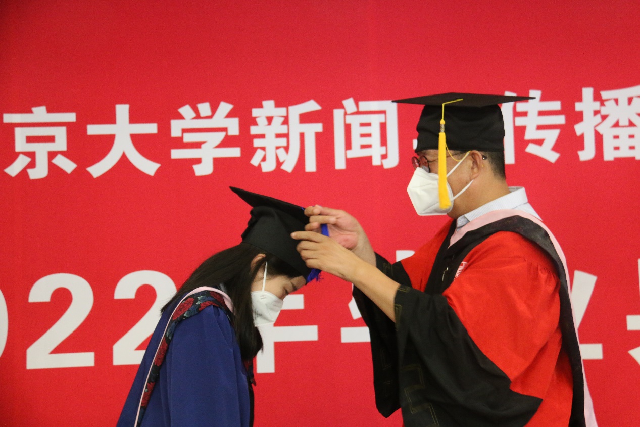 6月18日下午,北京大学新闻与传播学院2022年毕业典礼在蒙民伟楼报告厅举行。本次活动采取线上线下相结合的方式,广大师生及学生家长相聚云端,共同庆祝新传毕业生们圆满完成学业。新闻与传播学院院长陈刚,党委书记唐金楠,党委副书记卢亮,副院长陈开和、王维佳,学院学位委员会主席陆绍阳,程曼丽、吴靖、胡泳、师曾志、许静、何姝、祝帅、张慧瑜、王祯、张冉玥等老师及部分2022届毕业生线下参加典礼,严富昌、王异虹、高忠欣、刘杨、曾育平等老师和部分毕业生、家长在线上参会。