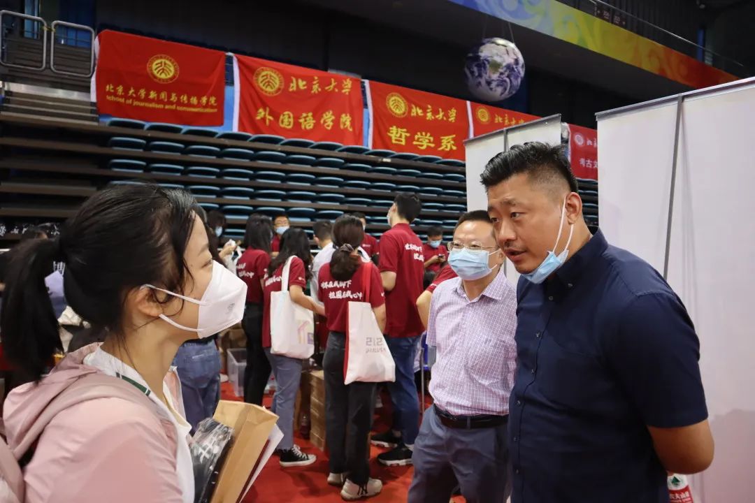 北京大学党委书记郝平、校长龚旗煌到达新传迎新接待点,与现场同学亲切交流,并合影留念。
