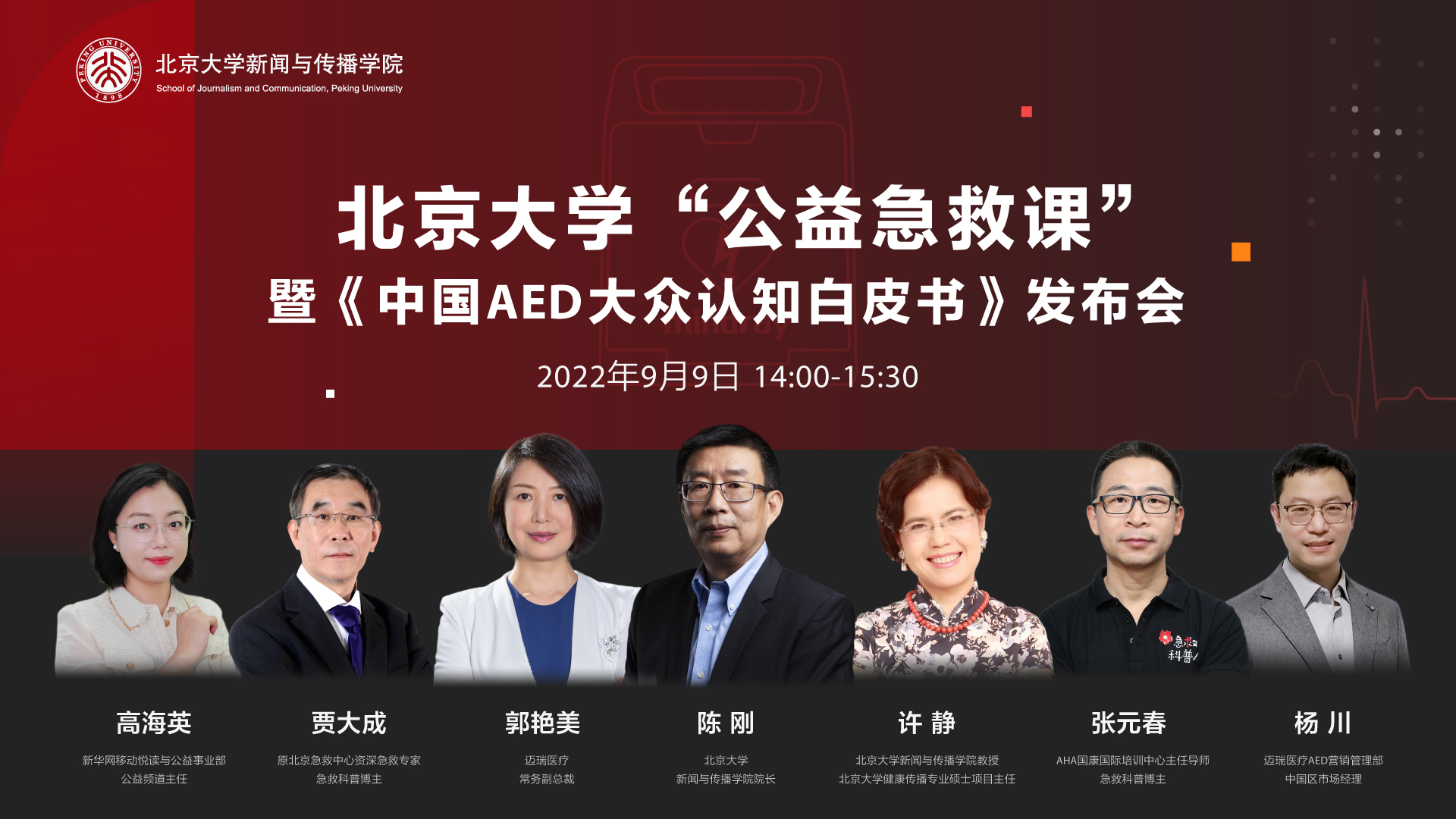 2022年9月9日,由北京大学新闻与传播学院主办,深圳迈瑞生物医疗电子股份有限公司协办的“北京大学‘公益急救课’暨《中国AED大众认知白皮书》发布会”顺利举行。此次活动汇集了学界与业界的专业代表,共同探讨中国AED急救的现在与未来,呼吁更多人才和力量参与到急救事业之中。