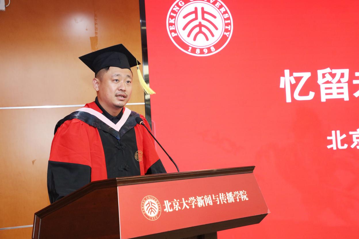 唐金楠为优秀硕士毕业论文获奖同学颁发证书,并为毕业生寄语。他围绕“思想”、“时代”和“改变”三个关键词,表达了对毕业生的祝福和期望。唐金楠指出,在北京大学建校125周年之际,毕业生们应追根溯源,在北大的历史上寻找自己的根脉、明晰未来的方向,铭记北大所给予的思想力量。他鼓励同学们在不确定的时代下寻找确定性,关注时代、理解时代、融入时代。唐金楠表示,新闻与传播学科是在实践中不断发展、不断精进的,新传人要坚持知行合一、学以致用,为国家贡献力量,共创美好的未来。