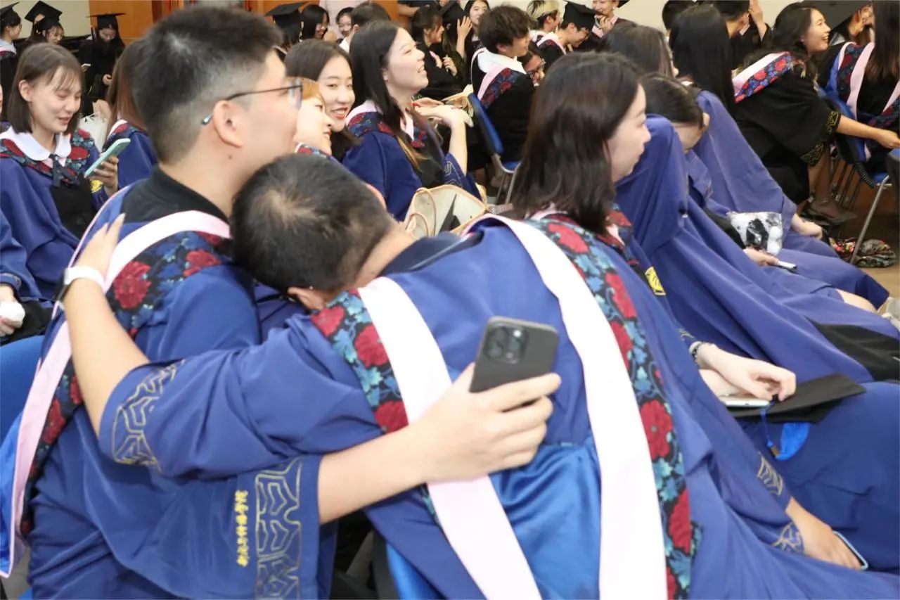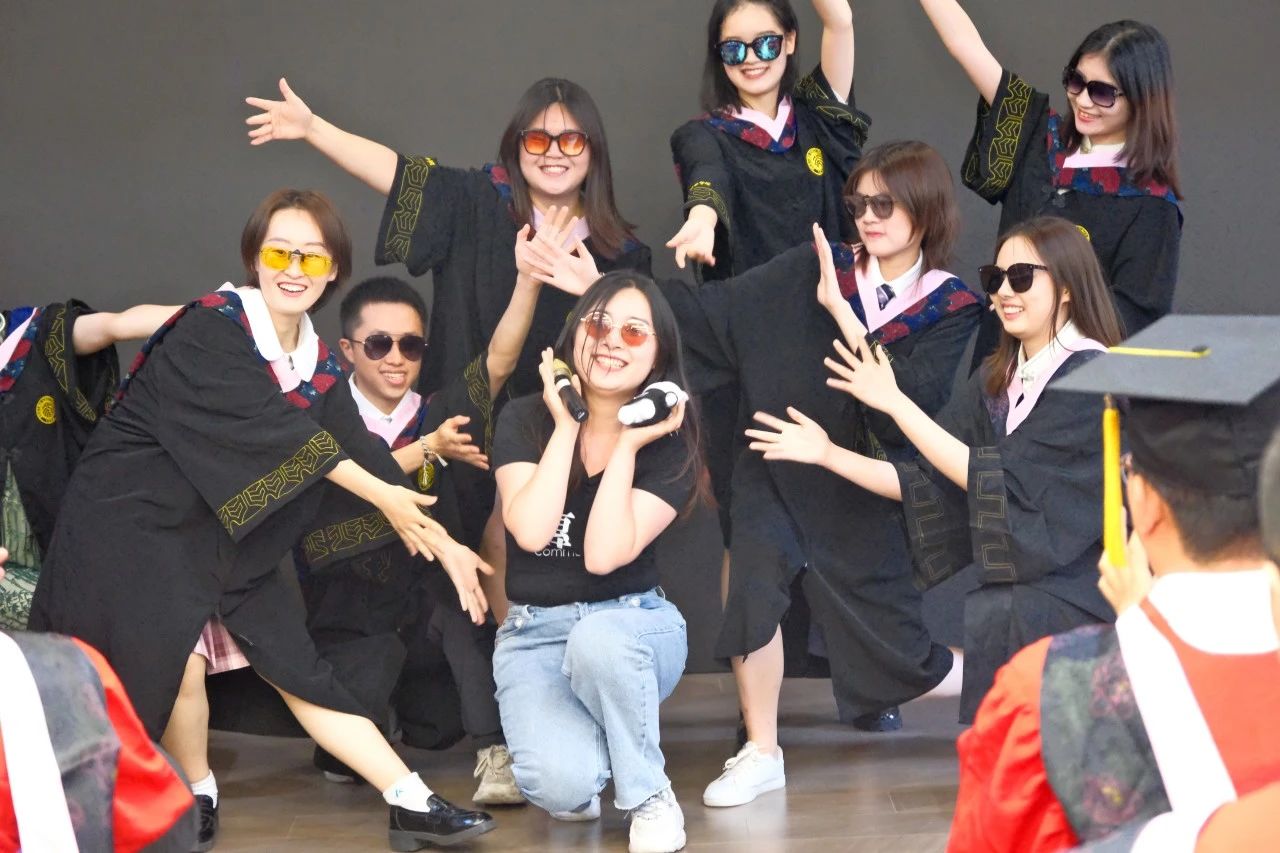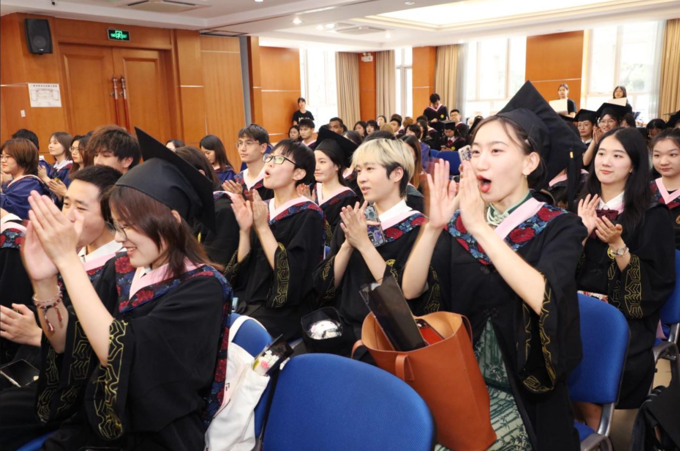 骊歌唱南门,薪火永相传。承载着毕业生们青春活力的纪念视频和歌舞表演拉开了典礼序幕。初入学时,毕业生们与燕园初遇、与南门相识、与新传相知;2023年,毕业生们穿上学位服,迎来毕业季,即将挥别燕园的岁月。纪念视频勾起回忆,歌舞表演诉说情谊,随着影像与歌声,不舍、感激与祝愿的掌声在报告厅里回荡。
