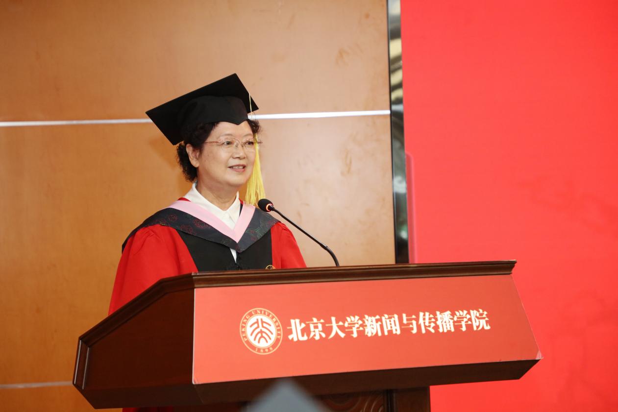 教师代表程曼丽为毕业生送上祝福与鼓励。她回溯了北京大学新闻学研究会的发展历程,强调了大变革时代下道路选择对每个人的重要性。程曼丽指出,一代人有一代人的使命,新时代中国共产党的使命任务,就是以中国式现代化推进中华民族的伟大复兴。身处新时代的重要历史转折点,如何用一代人的奋斗换取民族复兴的未来,是值得思考的问题,也是新时代留下的答卷。她勉励同学们以更开阔的眼界、更博大的胸怀,在不确定的时代做确定的自己,报效社会、报效国家、为建设人类命运共同体做出贡献。