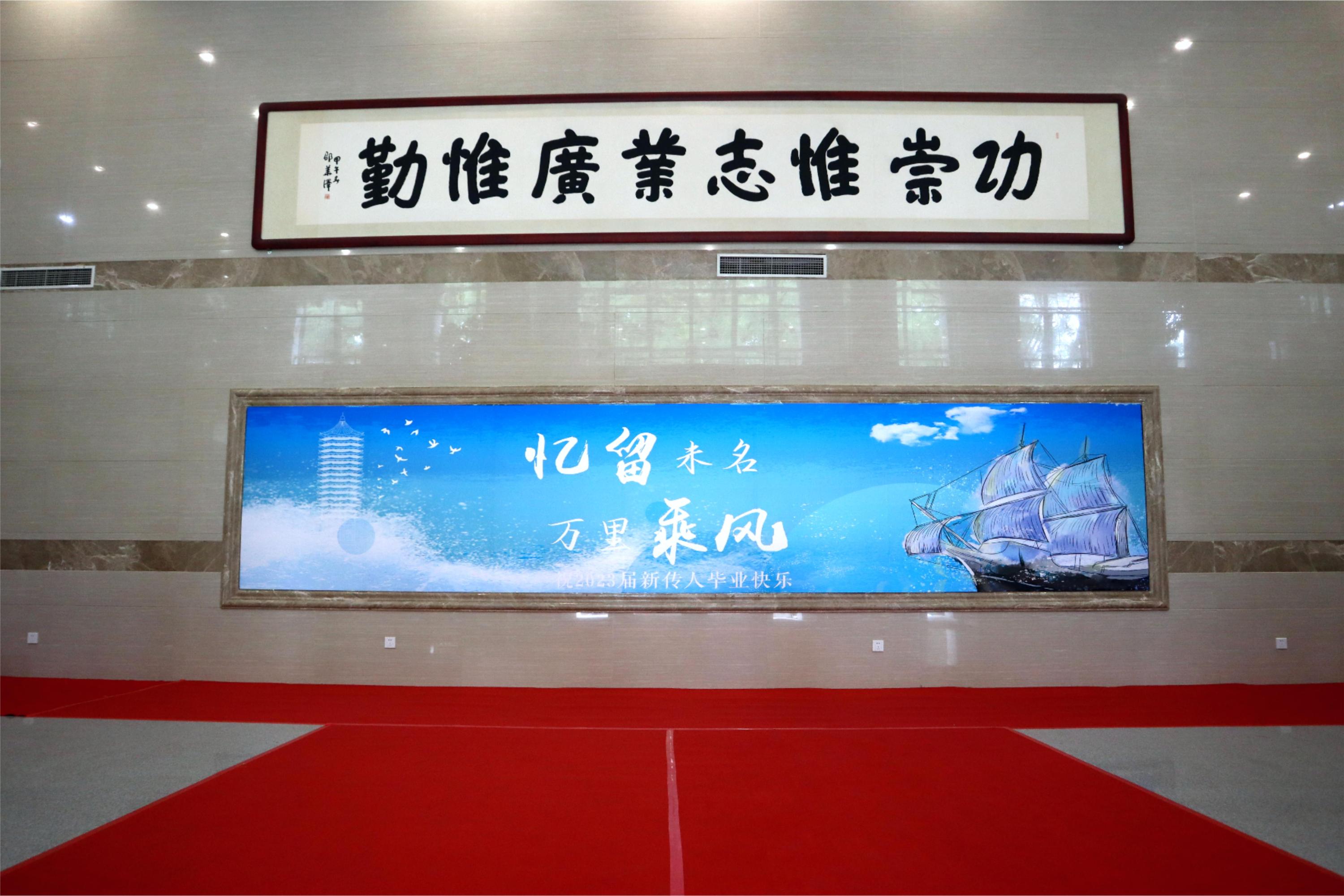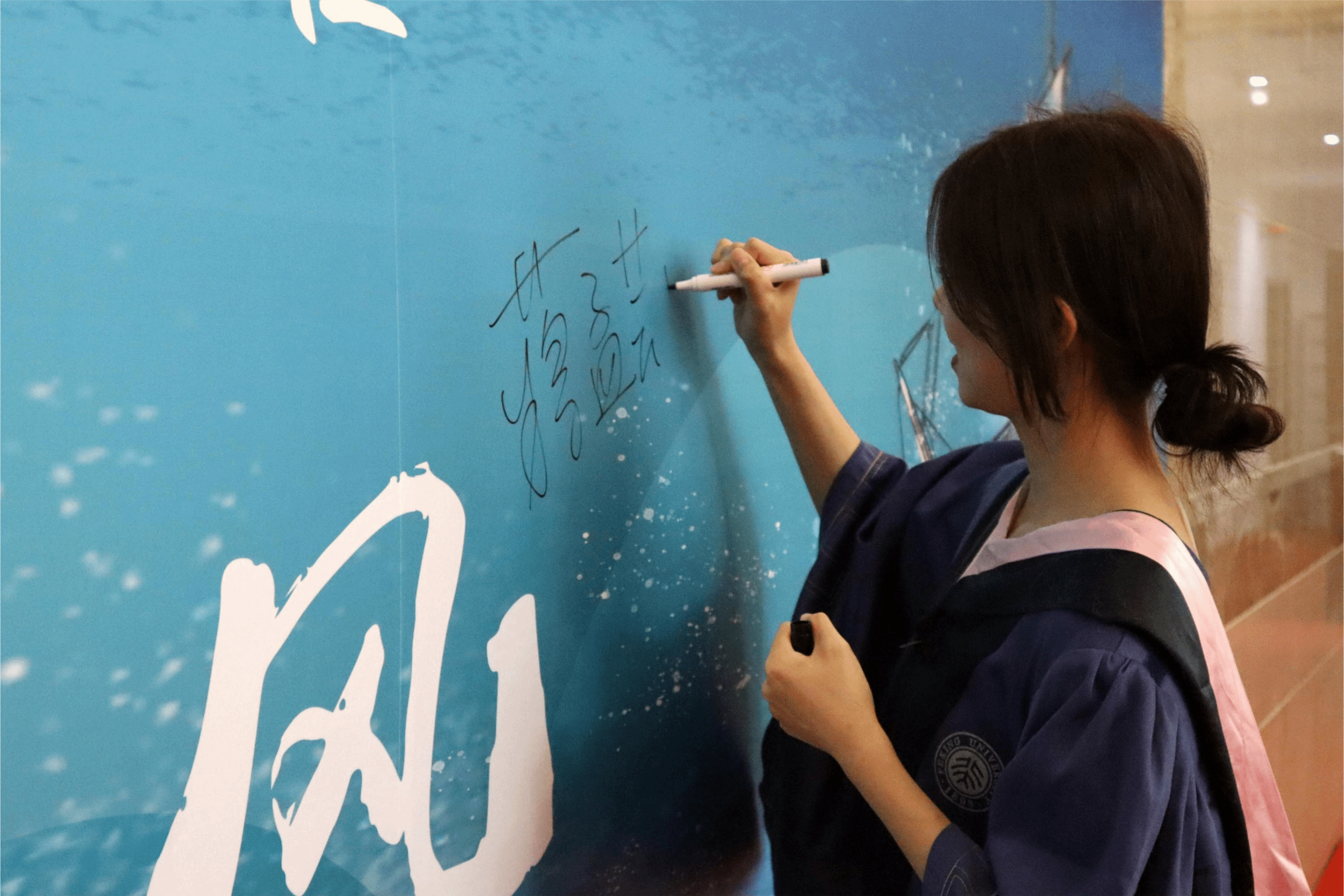 再会新传,签名留念。典礼开始前,毕业生们踏上红毯,走进学院大厅,在展板上签下名字,留下祝福语,表达对青葱岁月的热爱和对未来生活的美好憧憬。