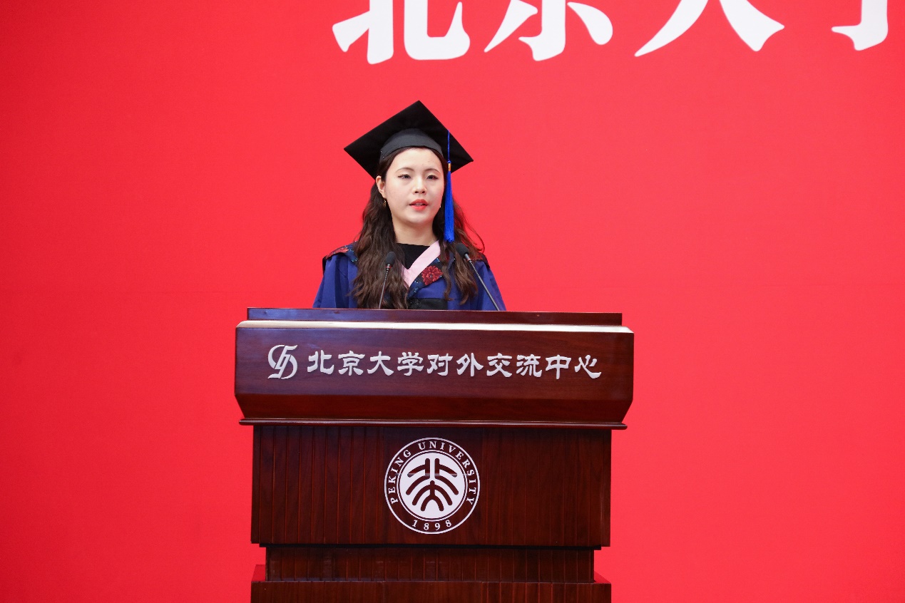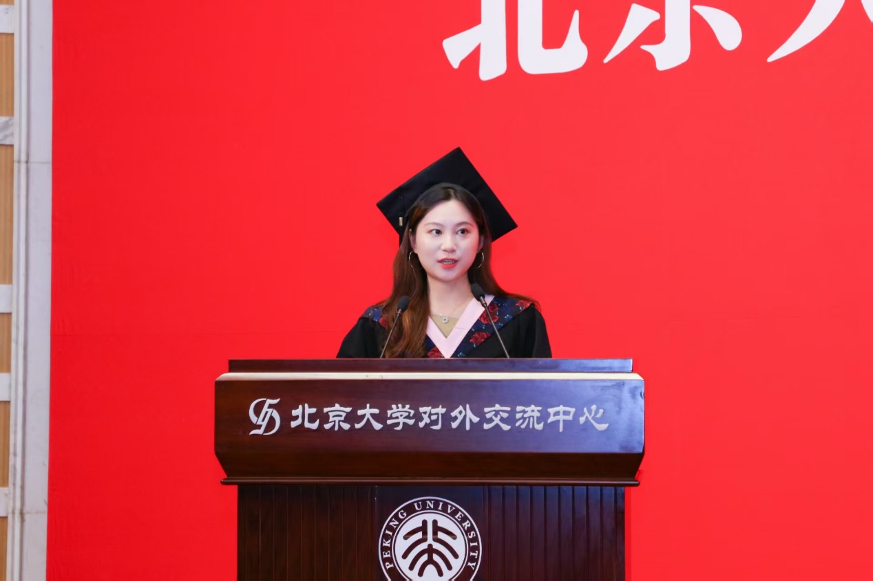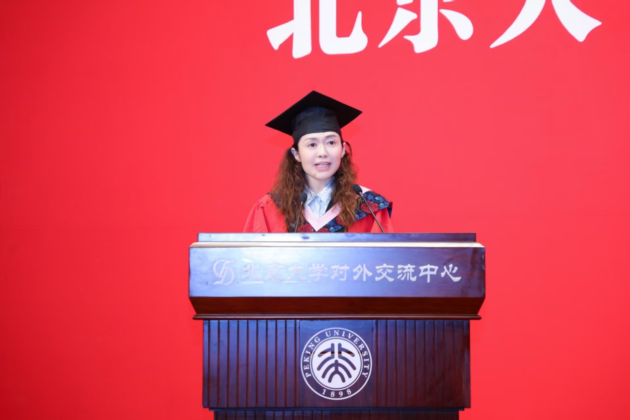 硕士毕业生代表刘好以“放眼全球,扎根泥土,向光而行”为脉络,串联起首届北大国传项目学子的成长体悟。她表示,“放眼全球”的培养,赋予了超越个体、拥抱世界的格局,也让同学们更加坚定地走向国际舞台。“扎根泥土”的实践让同学们明白,真实的力量源于脚下的泥土,生动的中国故事存在于广袤的田野。展望未来,她呼吁新传人秉持“向光而行”的信念,做党的政策主张的传播者、时代风云的记录者、社会进步的推动者、公平正义的守望者,为国家发展与社会进步贡献青春力量。