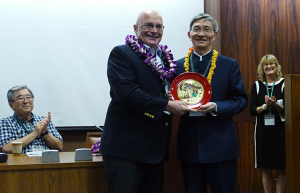 Former Peking University School of Journalism and Communication Executive Dean Gong Wenxiang presents a gift to East-West Center President Dr. Richard R. Vuylsteke