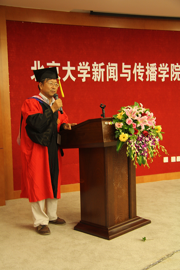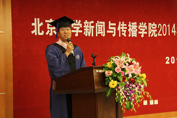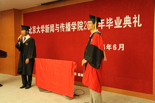 6月30日下午13:00,北京大学新闻与传播学院2014届毕业典礼在新传蒙民伟楼报告厅举行。这是在学院新大楼举办的第一个毕业典礼。新闻与传播学院院长陆绍阳教授、党委书记陈刚教授、副院长俞虹教授、吴靖教授、党委副书记王洪波以及学院的老师们出席了典礼。