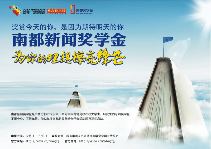2013年南都新闻奖学金已经正式启动, 12月1日-31日接受中国内地高校在读大学生进行在线申报。据悉,今年南都新闻奖学金的申报条件有所变化,申报作品须明确为新闻类、评论类或多媒体类,同时,每位申报者最多只可在报名系统内上传2篇作品。