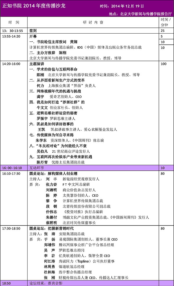 你想聆听来自传媒精英人士的集体发声吗?你想近距离感受行业大牛们的魅力风采吗?2014年12月19日13:30-18:50,由正知书院主办、北京大学新媒体营销传播(CCM)研究中心联合主办的“媒变时代——正知书院2014年度传播沙龙”将在北京大学新闻与传播学院一层报告厅举行,数十位传媒领袖将与我们分享来自行业一线的经验感悟。在各自领域内都斩获不俗的业绩的他们将带给我们怎样的惊喜和收获?让我们拭目以待!