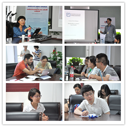 • 媒体交流:暑期班安排了两次与中外媒体专家的对话研讨。分别是7月4日下午与奥地利新闻委员会的Mr. Alexander Warzilek关于奥地利案例研究中的媒介伦理的探讨,以及在7月9日下午,学员与中国国际广播电台的黄廓教授就中国的真人秀电视节目与观众参与问题进行了交流。